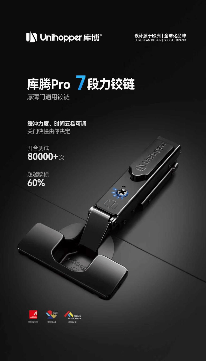 自 2003 年进入中国市场以来,Unihopper库博始终以 “设计源于欧洲 全球化品牌” 为定位,深耕定制家居五金领域,凭借源于欧洲的先进设计与营销理念、持续迭代的原创研发实力,稳步成长为行业标杆。作为国家高新技术企业,Unihopper库博不仅是全装修家居五金铰链、导轨、拉篮使用标准的主起草单位,更与万科采筑共建产品研发中心及国家实验室,以专业力量推动行业标准升级。