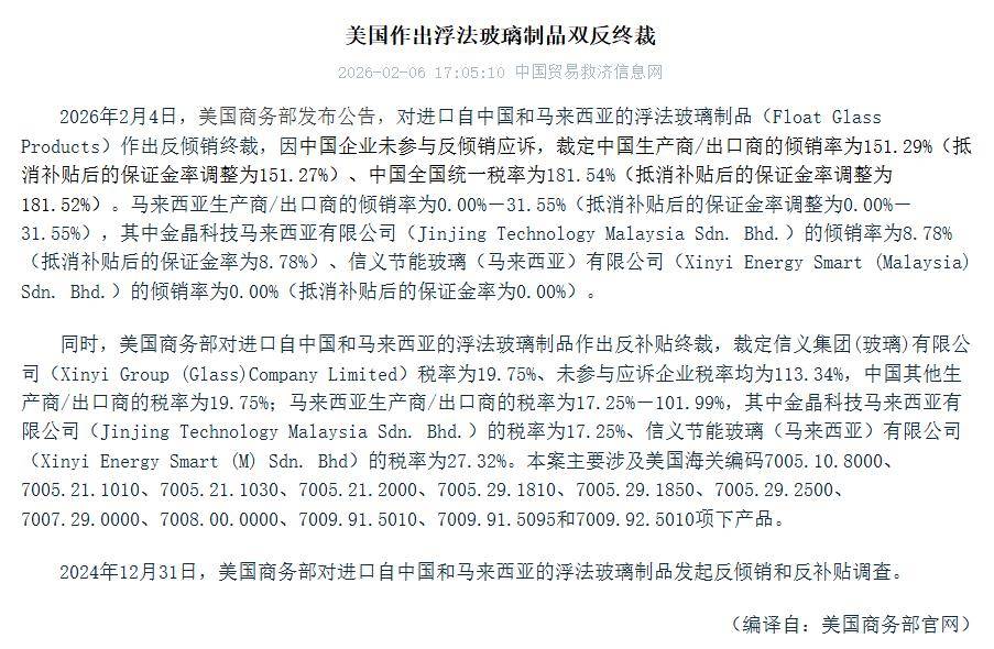 2026年2月4日,美国商务部正式宣布对来自中国和马来西亚的浮法玻璃产品作出反倾销和反补贴调查的最终裁定。因中国企业未参与反倾销应诉,美国商务部裁定中国生产商/出口商的倾销率为151.29%,而中国全国统一税率更高达181.54%。