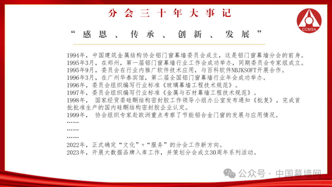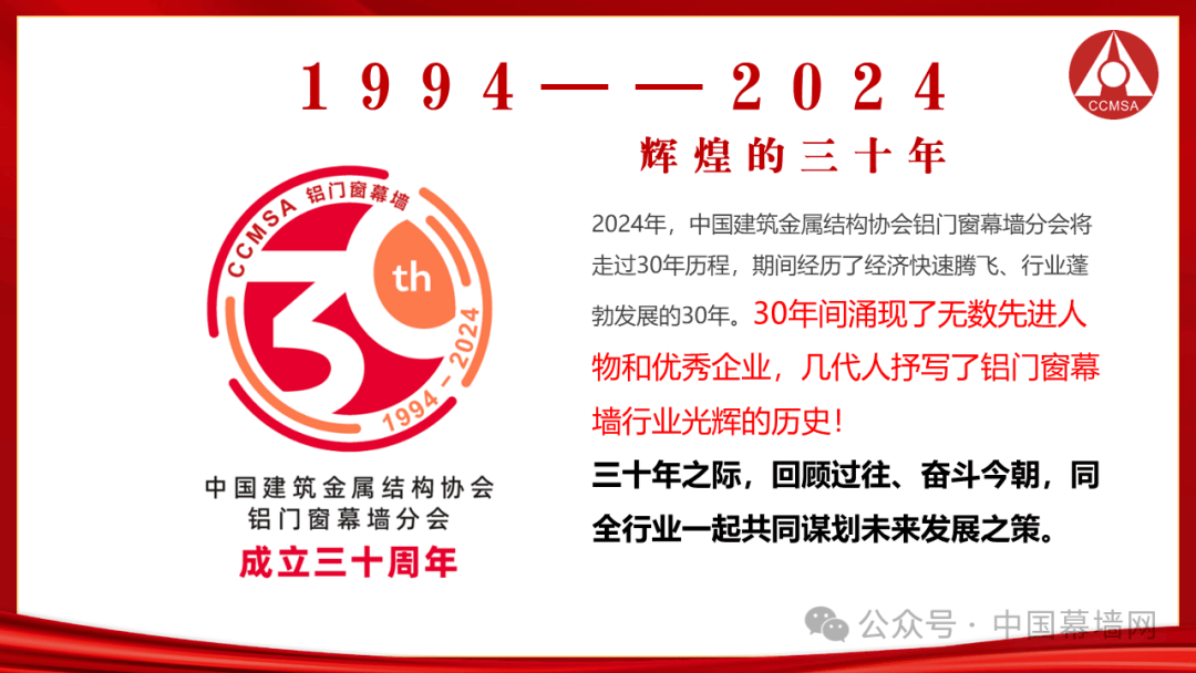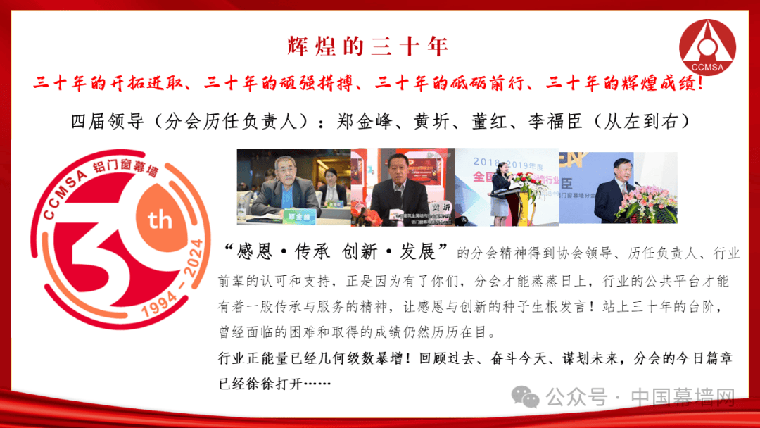 从1994—2024,三十年涌现了无数先进人物和优秀企业,几代人的努力共同抒写了铝门窗幕墙行业光辉的历史,分会成立三十年之际举办庆祝活动,与创业者、守业者、传承人们一起回顾过往、鼓励今朝,与行业同仁们共同谋划行业未来!