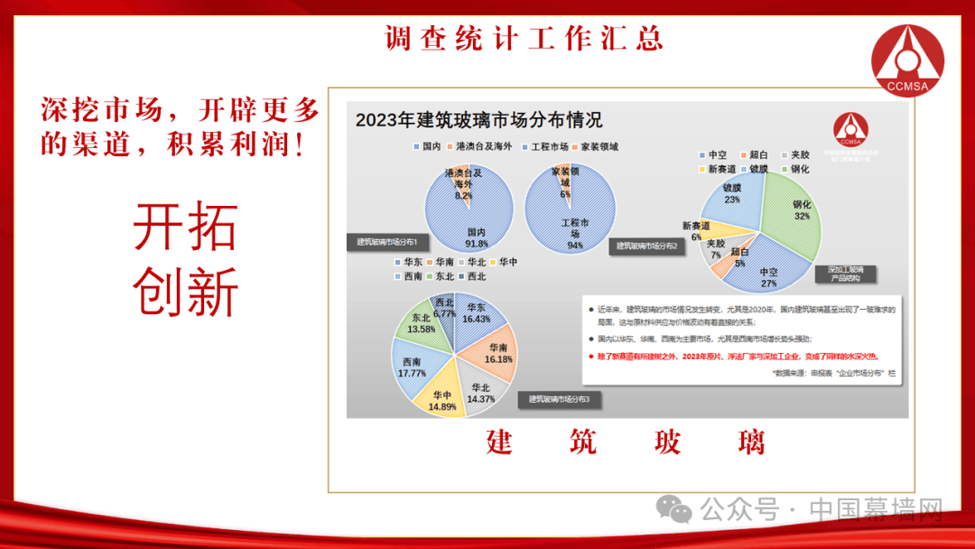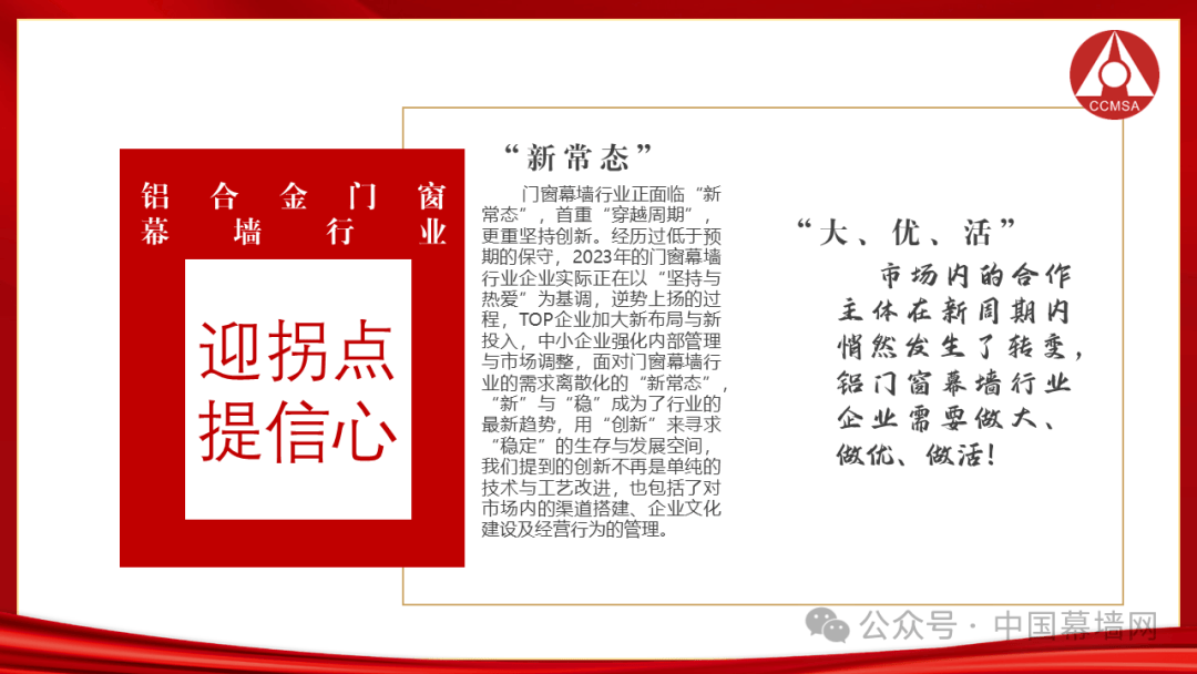 门窗幕墙行业正面临“新常态”,首重“穿越周期”,更重坚持创新。经历过低于预期的保守,2023年的门窗幕墙行业企业实际正在以“坚持与热爱”为基调,逆势上扬的过程,TOP企业加大新布局与新投入,中小企业强化内部管理与市场调整,面对门窗幕墙行业的需求离散化的“新常态”,“新”与“稳”成为了行业的最新趋势,用“创新”来寻求“稳定”的生存与发展空间,我们提到的创新不再是单纯的技术与工艺改进,也包括了对市场内的渠道搭建、企业文化建设及经营行为的管理。
