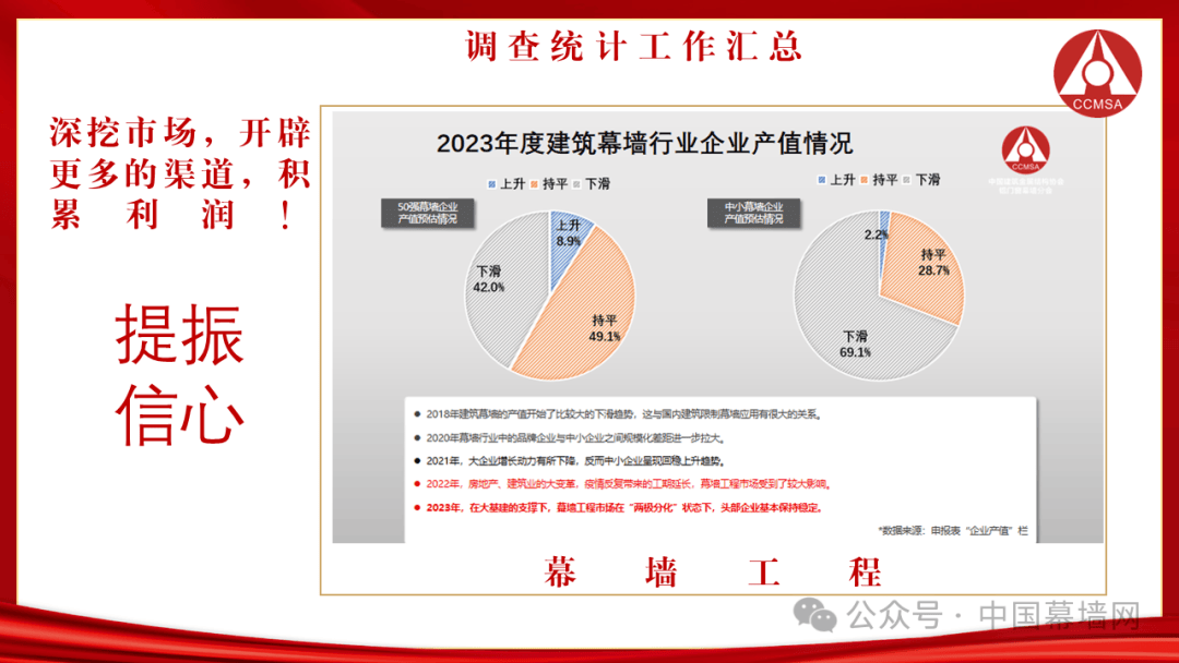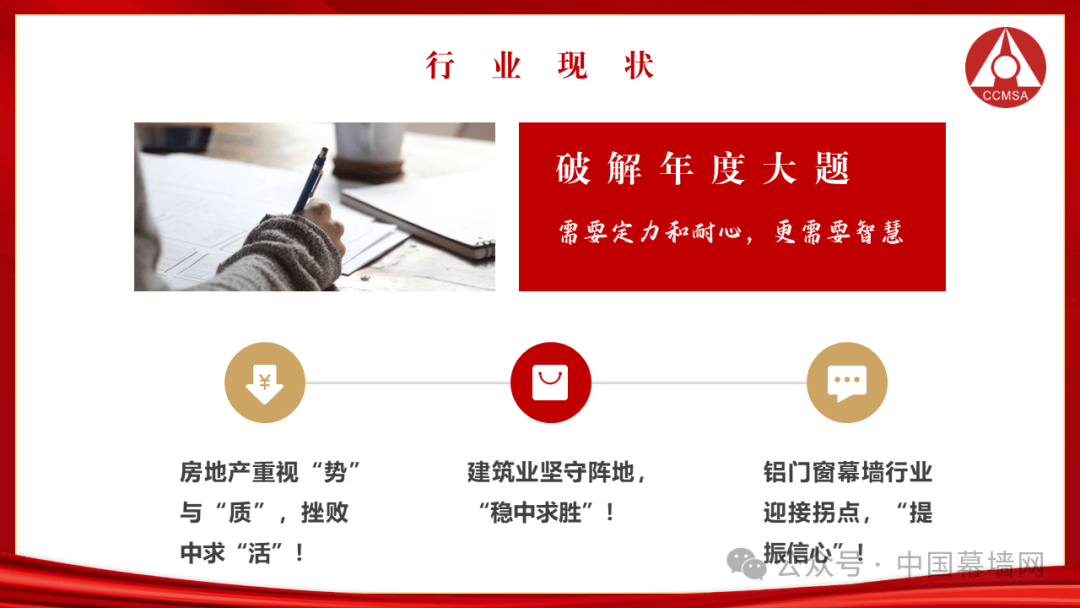 当前经济发展面临着三大挑战:一是消费信心需要时间来修复;二是国际贸易出口形势严峻;三是房地产遗留问题亟待解决,特别是与建筑总包、门窗幕墙分包、材料企业之间的“三角债”问题。回望过去的一年,中国经济经历了下滑、扭转、恢复、回稳的四个阶段;建筑业依然是拉动内需的一大利器,稳中求胜;房地产负增长严重但体量仍然巨大,正在挫中求活;门窗幕墙行业产值下降但信心不减,要首重质再重量。