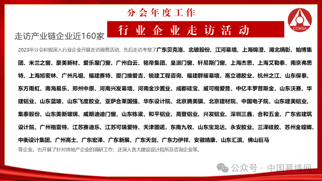 也开展了针对房地产企业的调研工作;还深入各大建设设计院所及咨询企业等。2023年共走访产业链企业近160家,深入调研门窗幕墙行业的产品研发、应用推广及市场运营情况,与被调研企业高层会晤,开展深入交流。