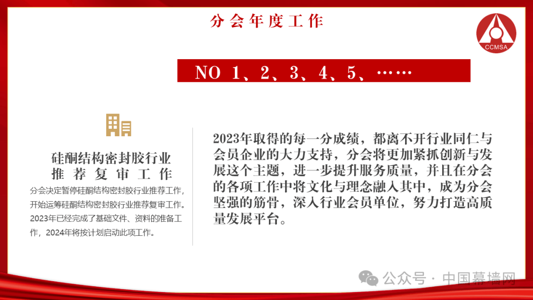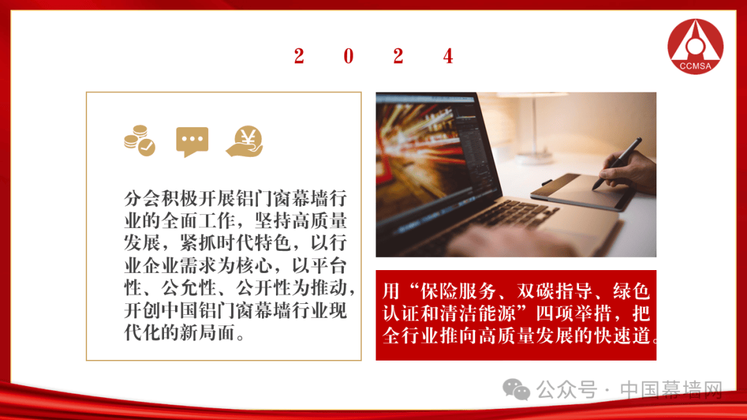 2024年分会积极开展铝门窗幕墙行业的全面工作,坚持高质量发展,紧抓时代特色,以行业企业需求为核心,以平台性、公允性、公开性为推动,开创中国铝门窗幕墙行业现代化的新局面。坚定不移的以“二十大”精神为指导,实施四轮驱动策略,推动行业高质量发展。根据国家总体方向,用“保险服务、双碳指导、绿色认证和清洁能源”四项举措,把全行业推向高质量发展的快速道。